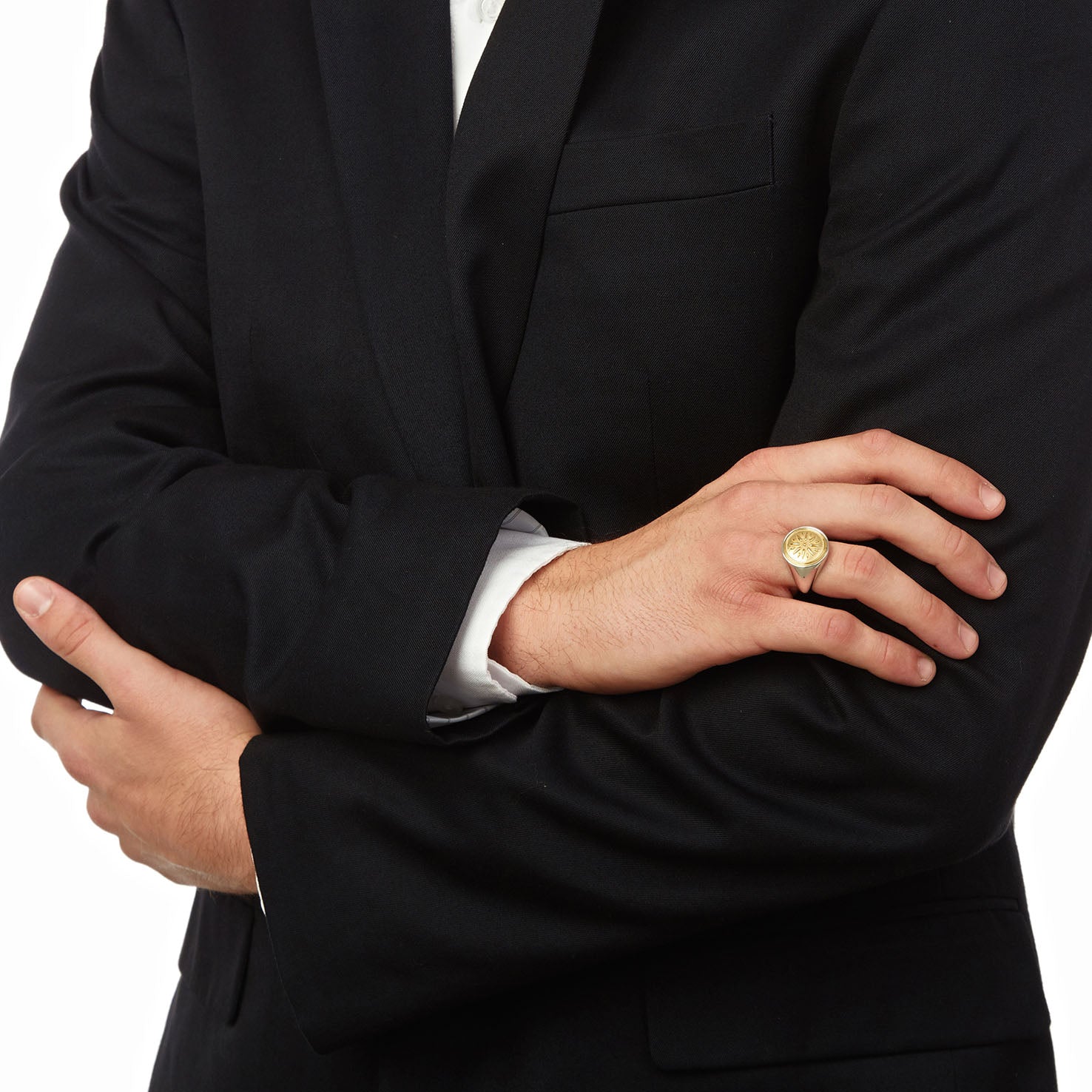 Αρχαϊκό χρυσό δαχτυλίδι «Μακεδονική Ασπίδα» από κίτρινο και λευκό χρυσό 18 καρατίων. Την εποχή των Μακεδόνων Βασιλέων, οι αρχαίοι Έλληνες συνήθιζαν να διακοσμούν τις ασπίδες τους με σύμβολα τιμής. Ο Μιχάλης αναβιώνει τη δόξα των μακεδονικών ασπίδων σε μια εκπληκτική συλλογή από χειροποίητα χρυσά δαχτυλίδια 18 καρατίων που μπορούν να φορεθούν άνετα τόσο από άνδρες όσο και από γυναίκες.