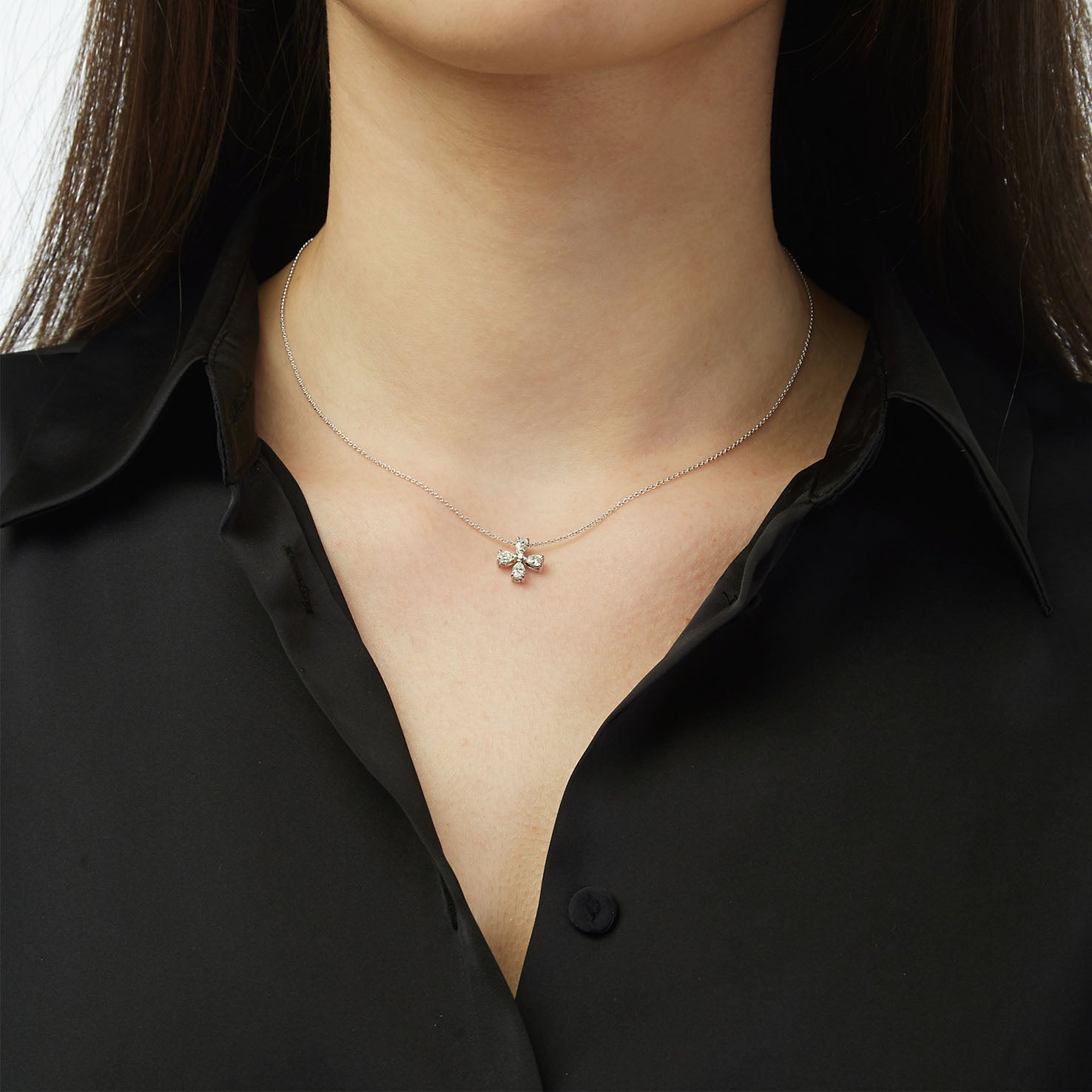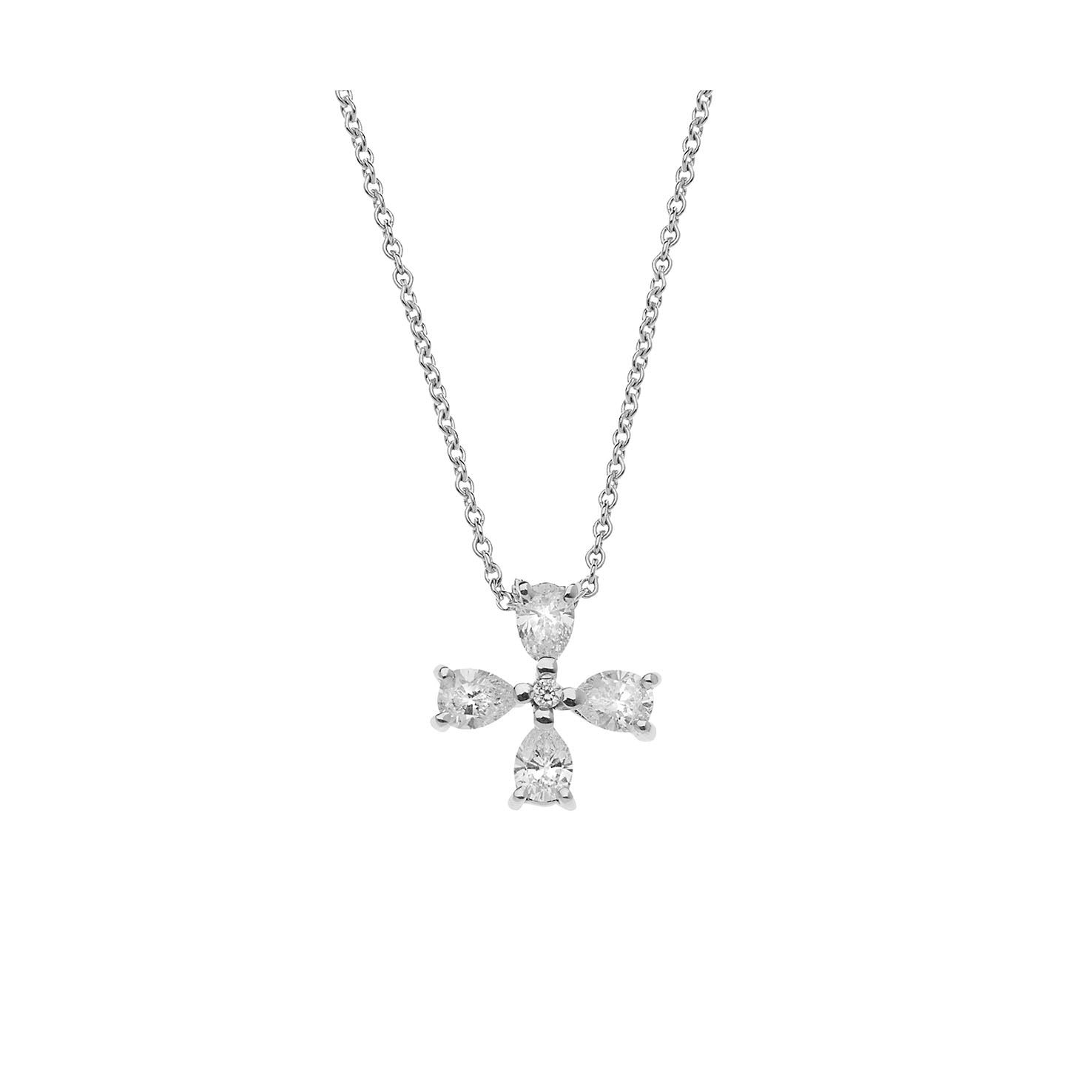 Σταυρός με διαμάντια κοπής αχλαδιού από λευκόχρυσο 18 καρατίων σε αλυσίδα. Συνολικό βάρος τεσσάρων διαμαντιών μπριγιάν κοπής αχλαδιού και ενός στρογγυλού διαμαντιού μπριγιάν 0,49 καρατίων. Στον Μιχάλη, επιλέγουμε σχολαστικά φυσικά διαμάντια ανώτερης λάμψης και ομορφιάς από ηθικές πηγές. Οι τεχνίτες μας κατασκευάζουν στο χέρι τον σταυρό. Μαζί με το κόσμημα σας θα λάβετε εγγύηση που καλύπτει τις προδιαγραφές του κοσμήματος και σας διασφαλίζει την ανώτερη ποιότητά του.