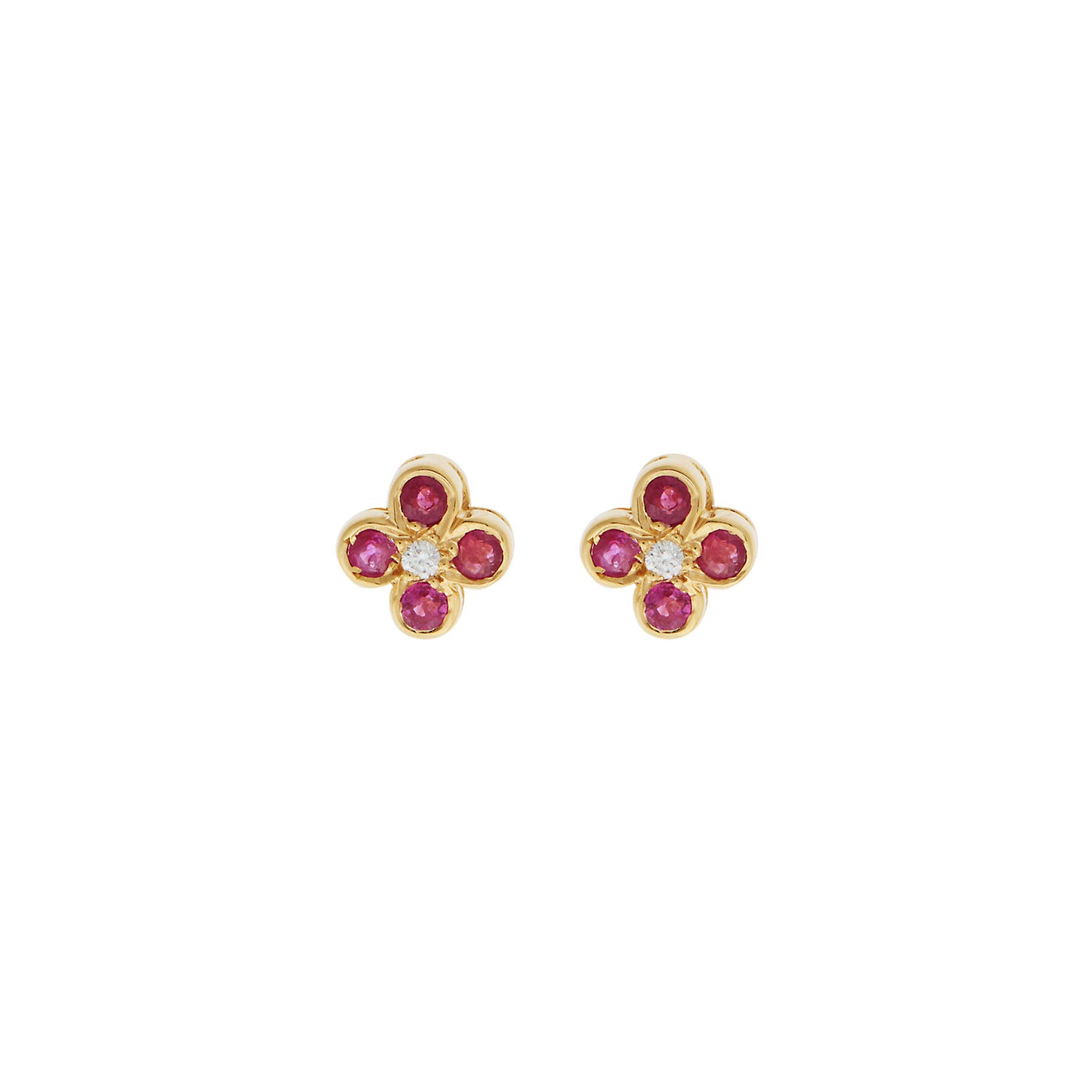 Σκουλαρίκια καρφωτά από κίτρινο χρυσό 18 καρατίων με οβάλ ρουμπίνια και διαμάντια κοπής μπριγιάν. Συνολικό βάρος ρουμπινιών 0,49 καράτια. Συνολικό βάρος στρογγυλών διαμαντιών μπριγιάν 0,04 καράτια.