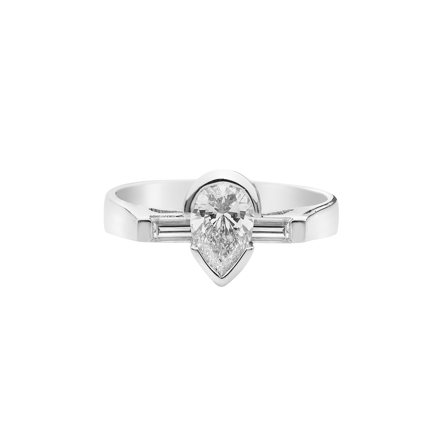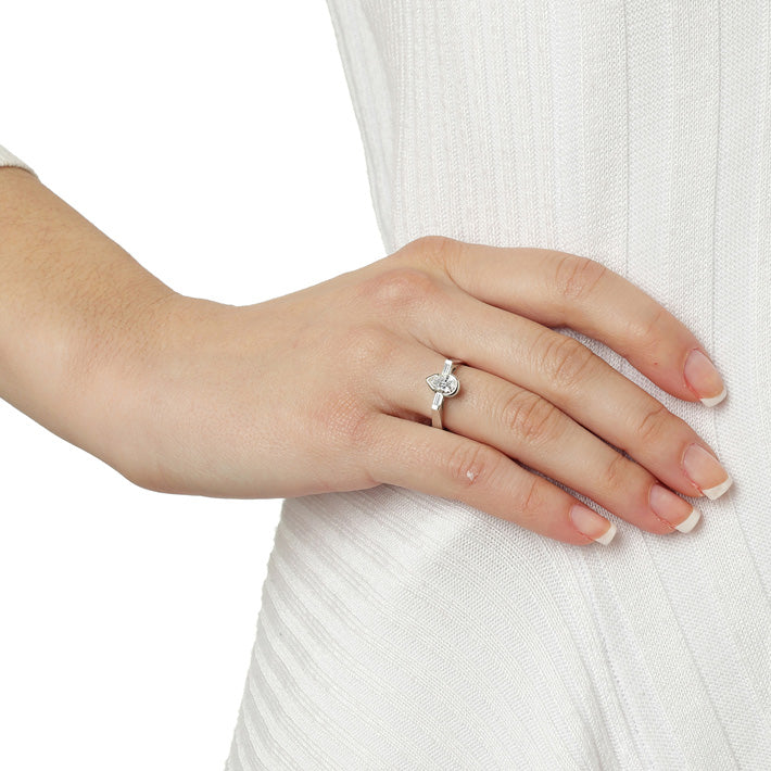 Diamond pear cut diamond solitaire 18 carat white gold. Weight of the diamond solitaire 0,76 carats. Weight of the two baguette side stones 0,22 carats. At Michalis, we meticulously select natural diamonds of superior sparkle and beauty from ethical sources. Our artisans craft by hand all our designs. With your jewel you shall receive a guarantee that covers the jewel's specifications and assures you of its supreme quality.