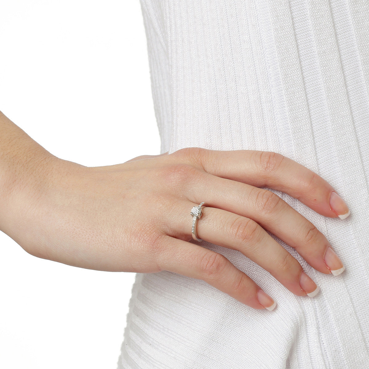 Diamond round brilliant cut diamond solitaire 18 carat white gold. Weight of the diamond solitaire 0,45 carats. Weight of paved diamonds 0,06 carats. At Michalis, we meticulously select natural diamonds of superior sparkle and beauty from ethical sources. Our artisans craft by hand all our designs. With your jewel you shall receive a guarantee that covers the jewel's specifications and assures you of its supreme quality.