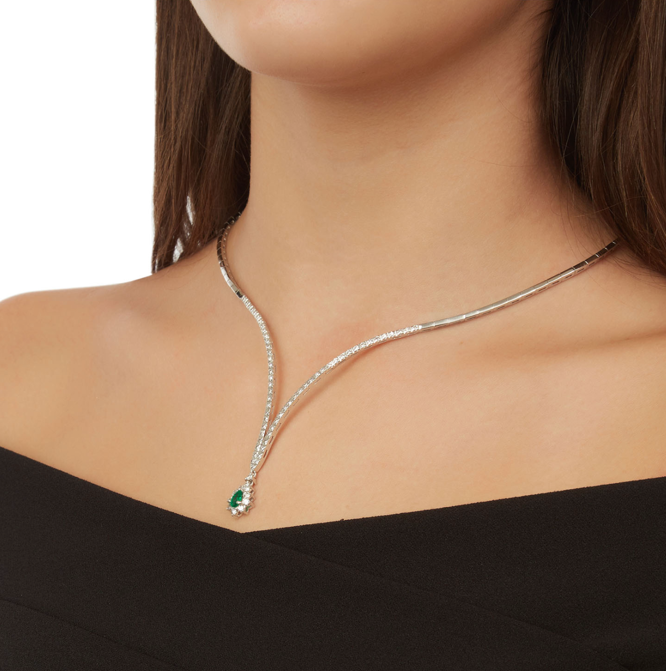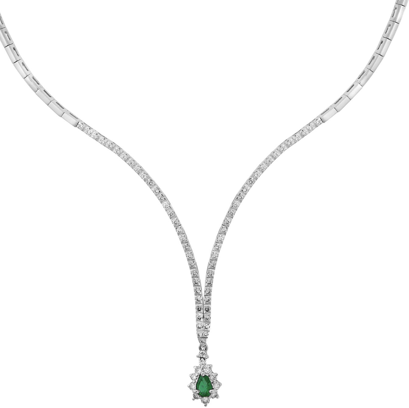 Emerald and Diamond Necklace, 18KT white gold. Pear cut emerald 0,41 carats. Round cut diamonds 1,67 carats total weight.