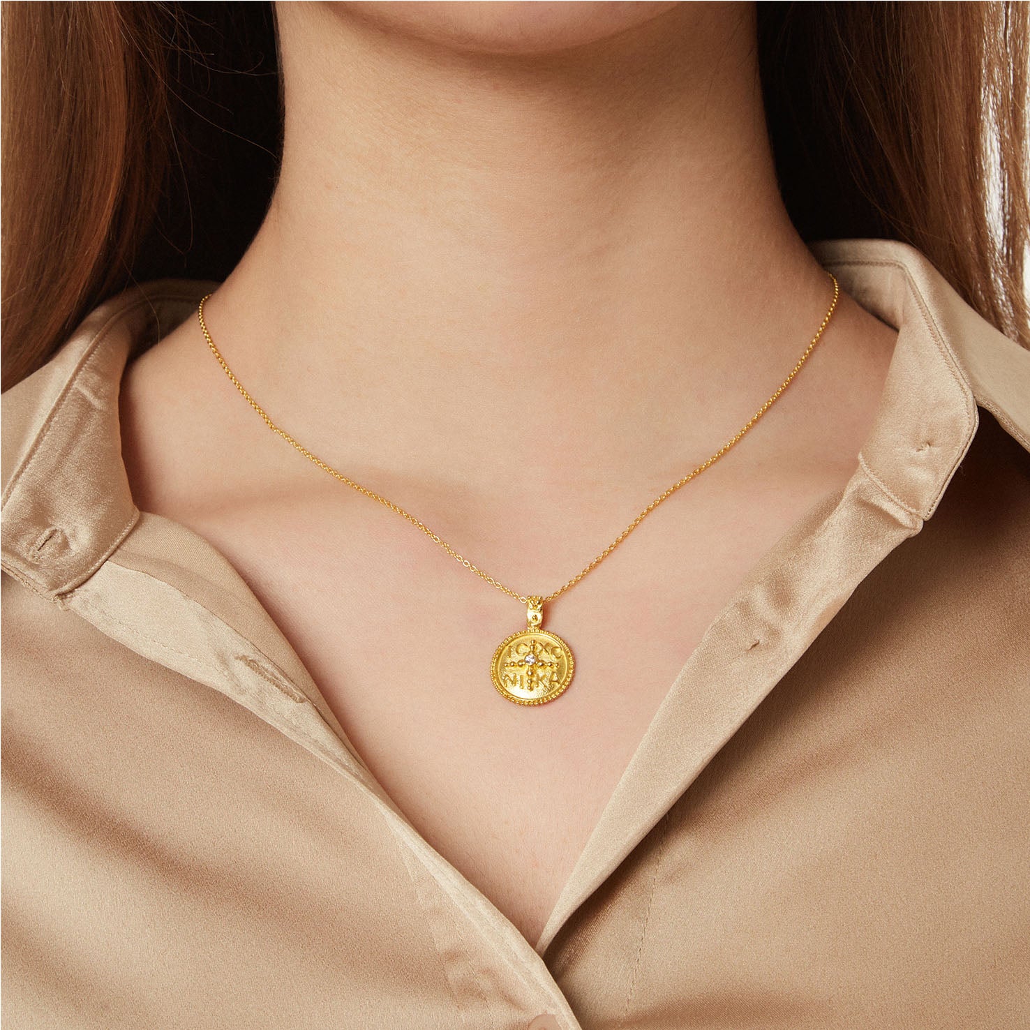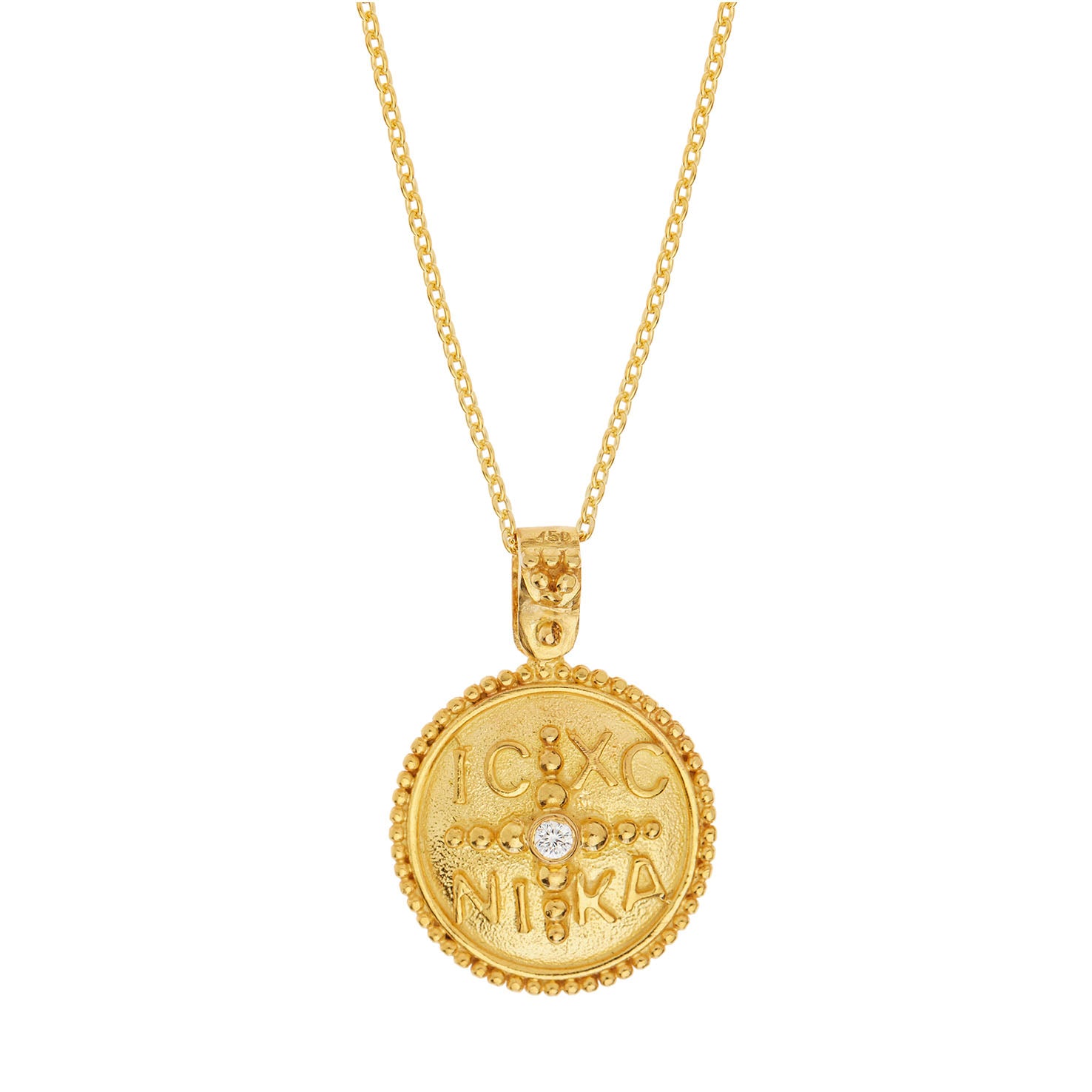 Handmade 14KT Yellow gold Byzantine Coin Pendant "Konstantinato" with a Brilliant Cut Diamond 0,03 carats. Konstantinato is a traditional Christian symbol of religious devotion and faith that is often worn as a form of protection against evil. Depending on your personal preference, our jeweler artisans handcraft it from 14KT or 18KT yellow gold with or without diamond. With your purchase you will receive a guarantee that will cover the specifications of your jewel and will assure you of its excellent quality.