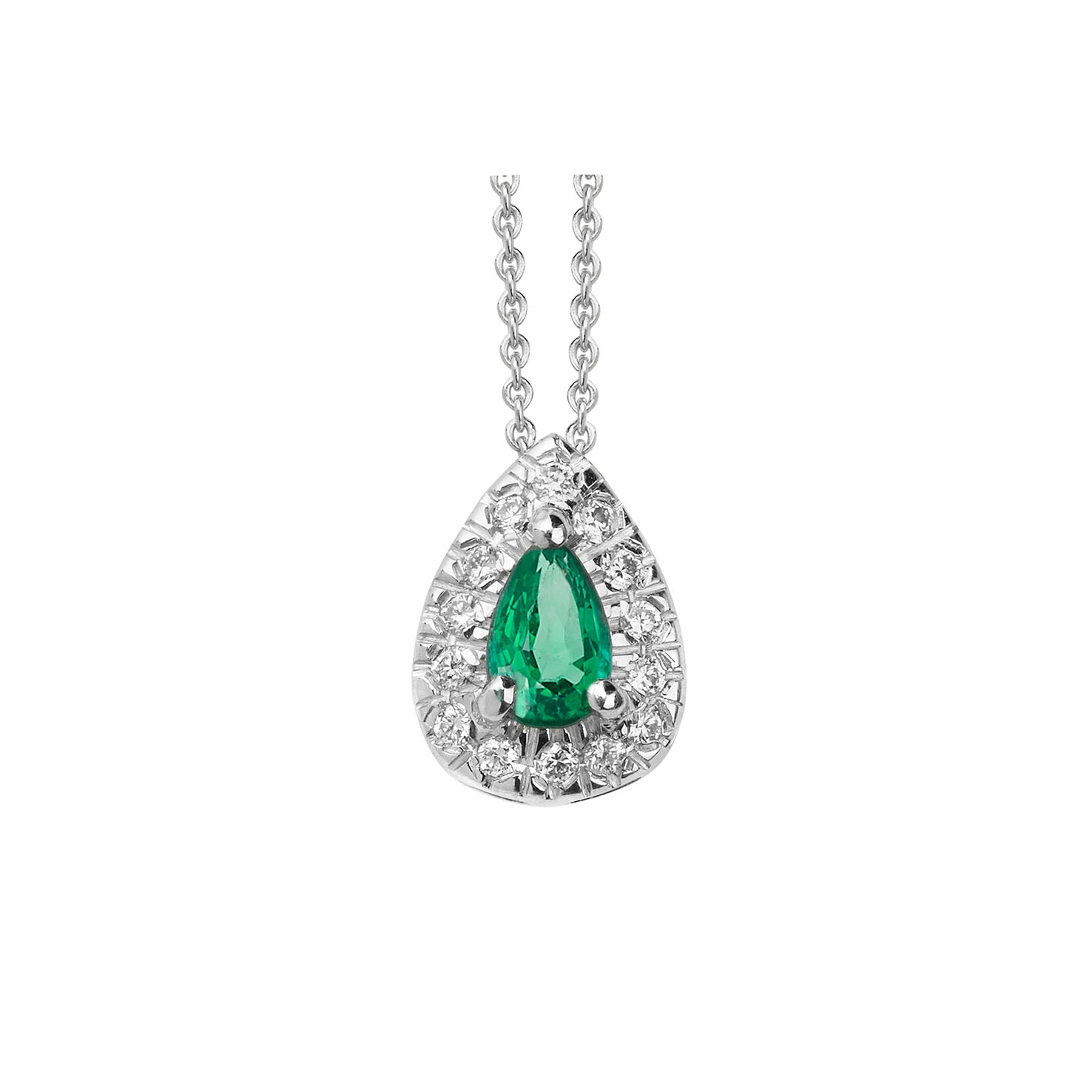 Necklace Pendant 18KT White Gold with a Pear cut Emerald and Brilliant cut Diamonds. Pear-Shaped Emerald 0,80 carats. Round brilliant cut diamonds 0,07 carats total weight. \n \nMichalis meticulously chose precious coloured stones for their beautiful colour and singular personality and diamonds of superior sparkle and beauty from ethical sources. We handcraft all Michalis jewelry so as we can adjust yours to meet your particular preferences of design and budget. Along with your jewelry you will receive a guarantee that will assure you of its excellent quality.