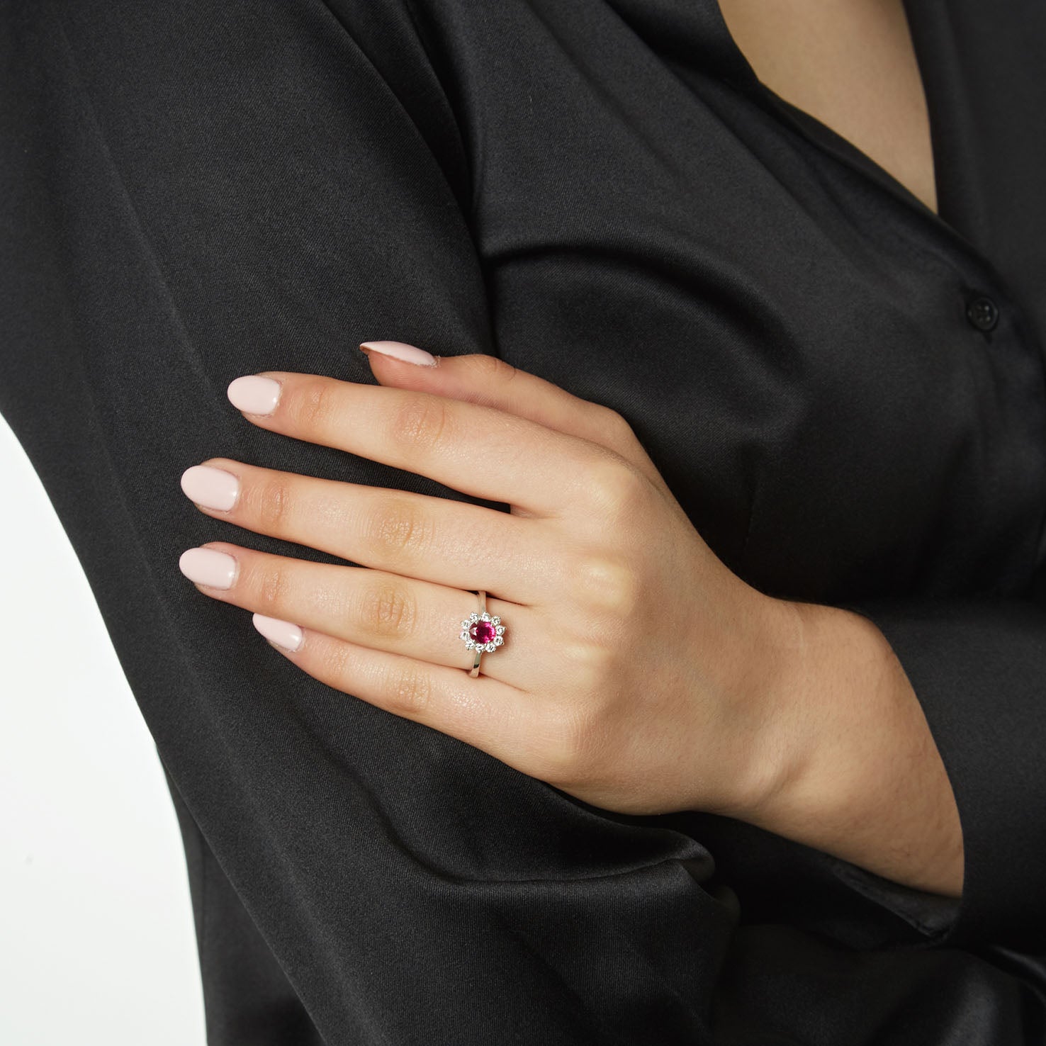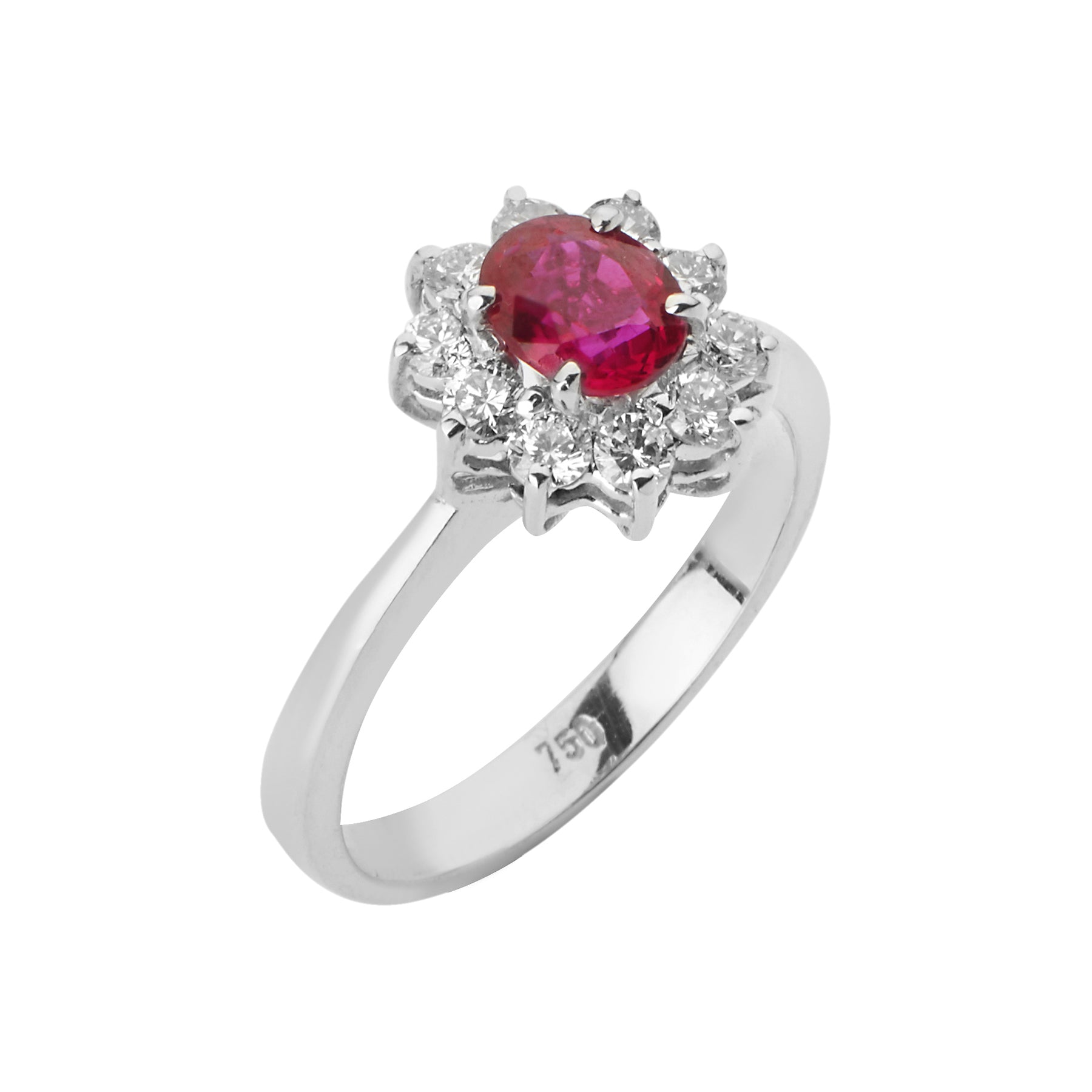 Ring 18KT White Gold with an Oval Ruby and Brilliant cut Diamonds.Ruby weight 0,76 carats. Brilliant cut diamonds total weight 0,40 carats. Michalis meticulously chose precious coloured stones for their beautiful colour and singular personality and diamonds of superior sparkle and beauty from ethical sources. We handcraft all Michalis jewelry so as we can adjust yours to meet your particular preferences of design and budget. Along with your jewelry you will receive a guarantee that will assure you of its excellent quality.