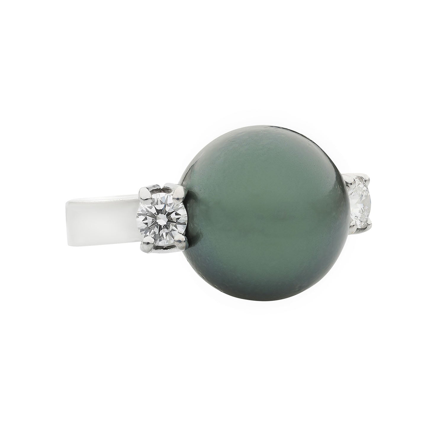 South sea black pearl and diamond ring 18 carat white gold. South sea pearl's size 16,00 mm. Total weight of the two round brilliant cut diamonds 0,68 carats. At Michalis we select pearls with beautiful luster and diamonds of superior sparkle and beauty from ethical sources. Our artisans craft by hand all our designs. The ring can be adjusted according to your personal preferences. Your jewel will be accompanied by a guarantee that will cover its specifications and will assure you of its supreme quality.